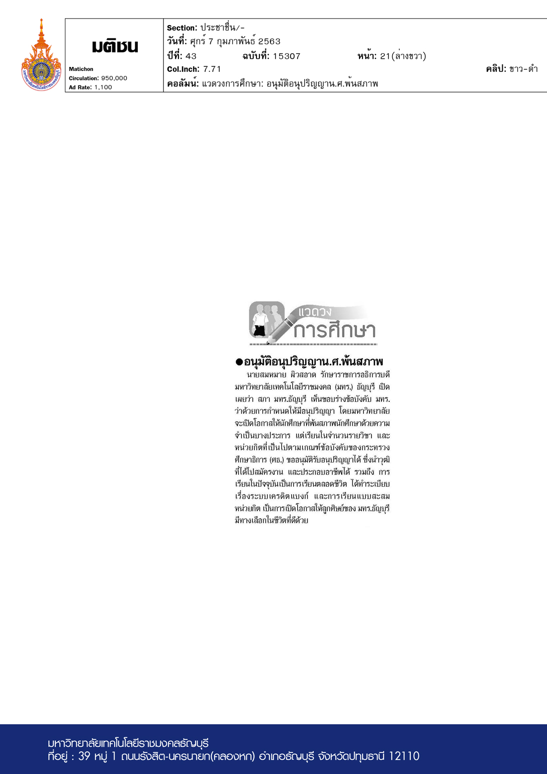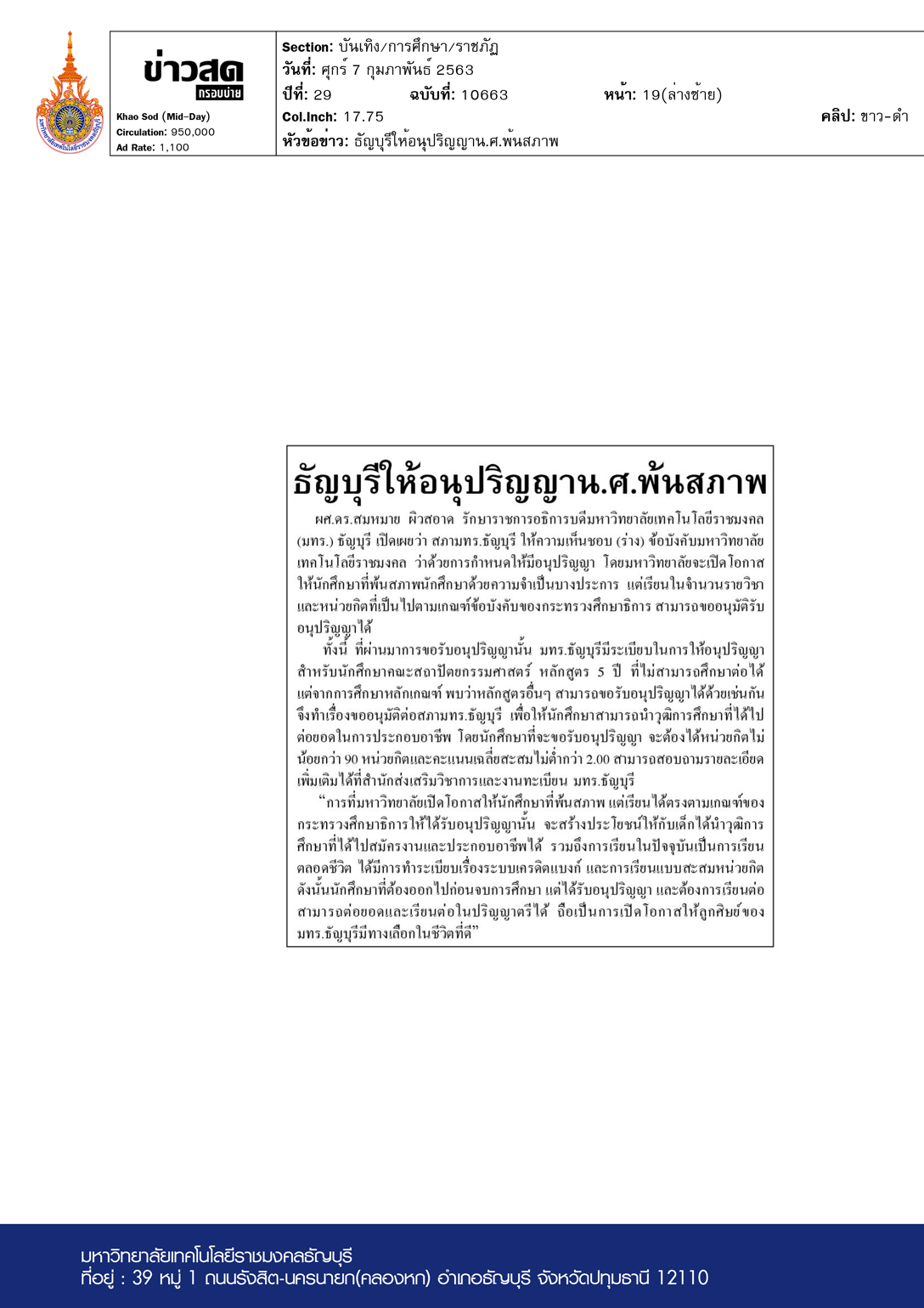 ไทยรัฐ ฉบับวันที่ 7 กุมภาพันธ์ พ.ศ. 2563 มหาวิทยาลัยเทค […]