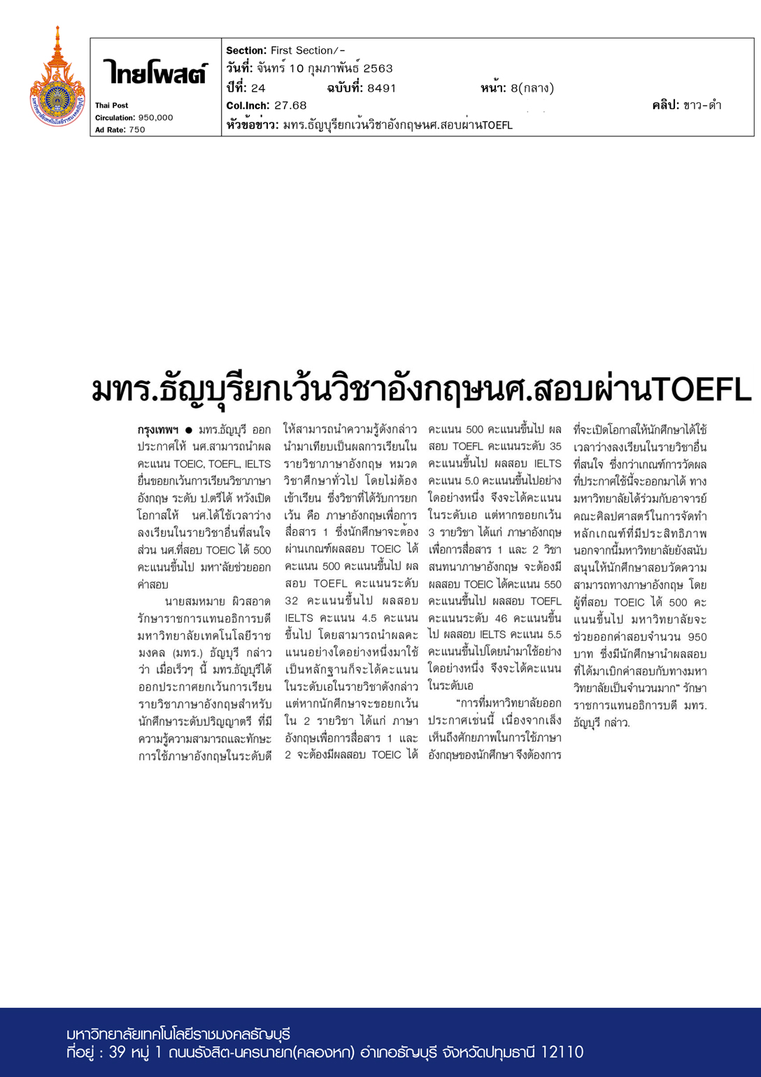 มทร.ธัญบุรียกเว้นวิชาอังกฤษนศ.สอบผ่านTOEFL