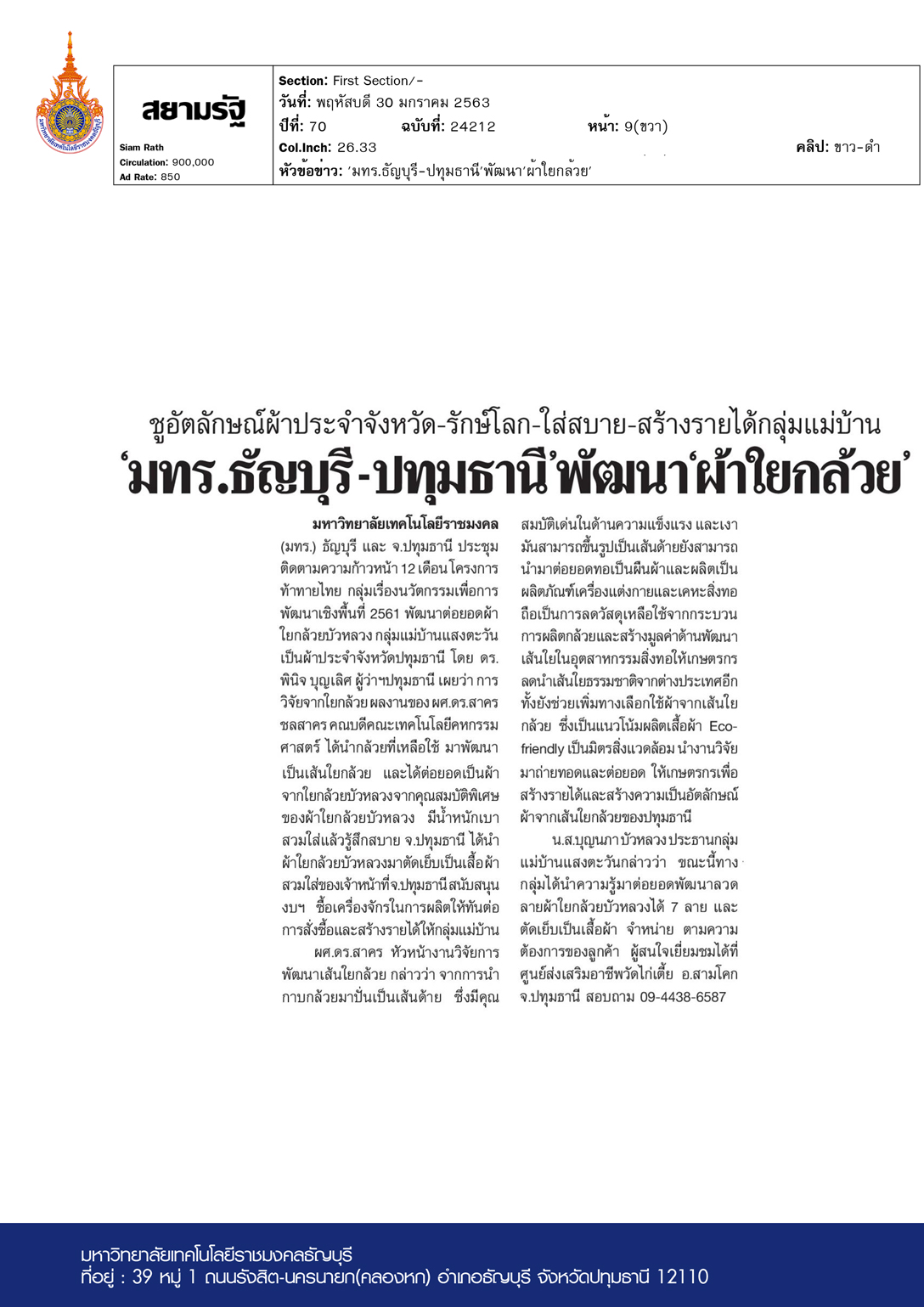 ผวจ. ปทุมธานี จับมือ มทร.ธัญบุรี หนุนผ้าใยกล้วยบัวหลวง เป็นผ้าประจำจังหวัด