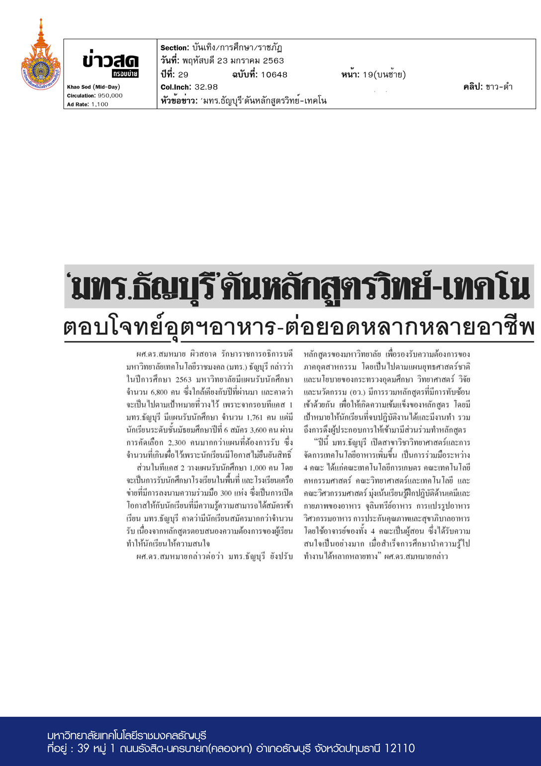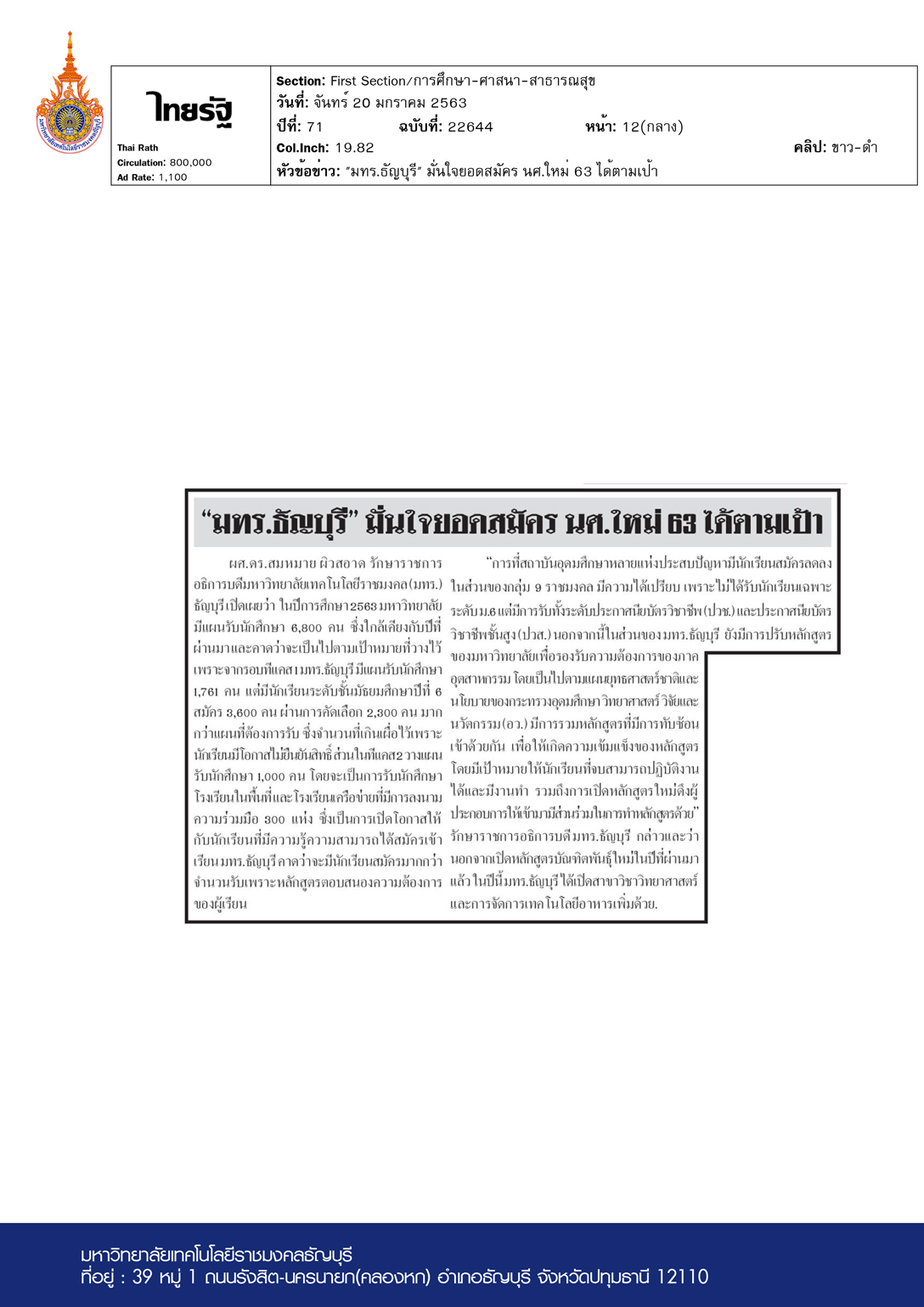 “มทร.ธัญบุรี” มั่นใจยอดสมัคร นศ.ใหม่ 63 ได้ตามเป้า