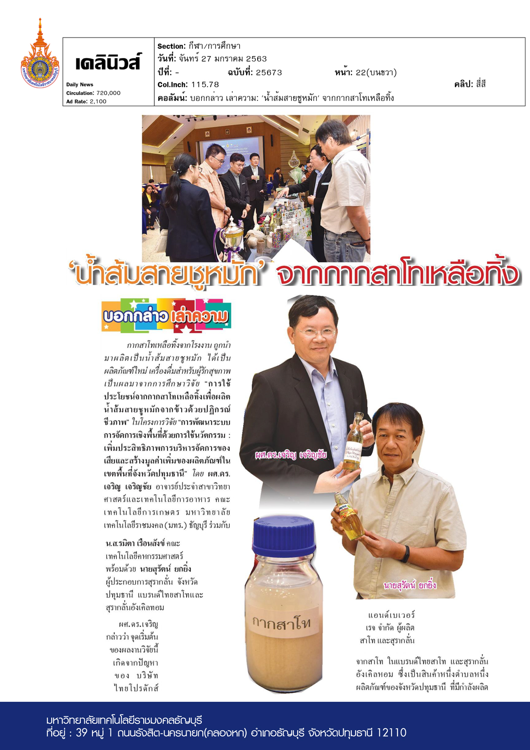 คอลัมน์ ด้วยสมองและสองมือ: ‘มทร.ธัญบุรี’ แปรรูปจากกากสาโท สู่เครื่องดื่ม’เฮลธ์ตี้ดริงก์