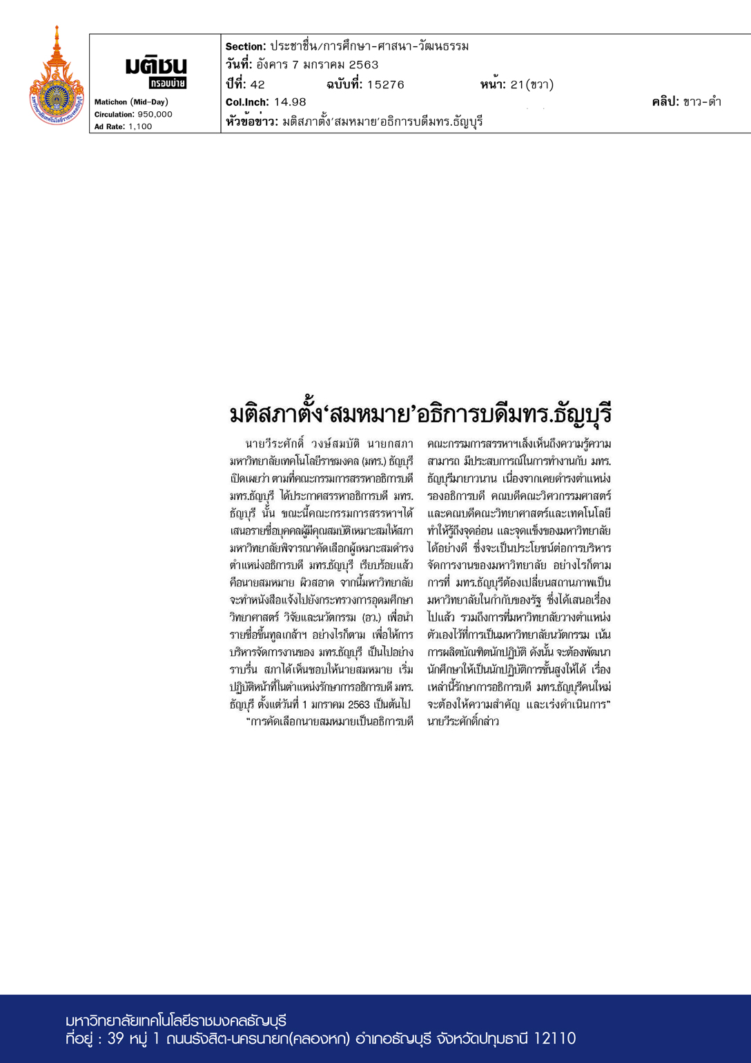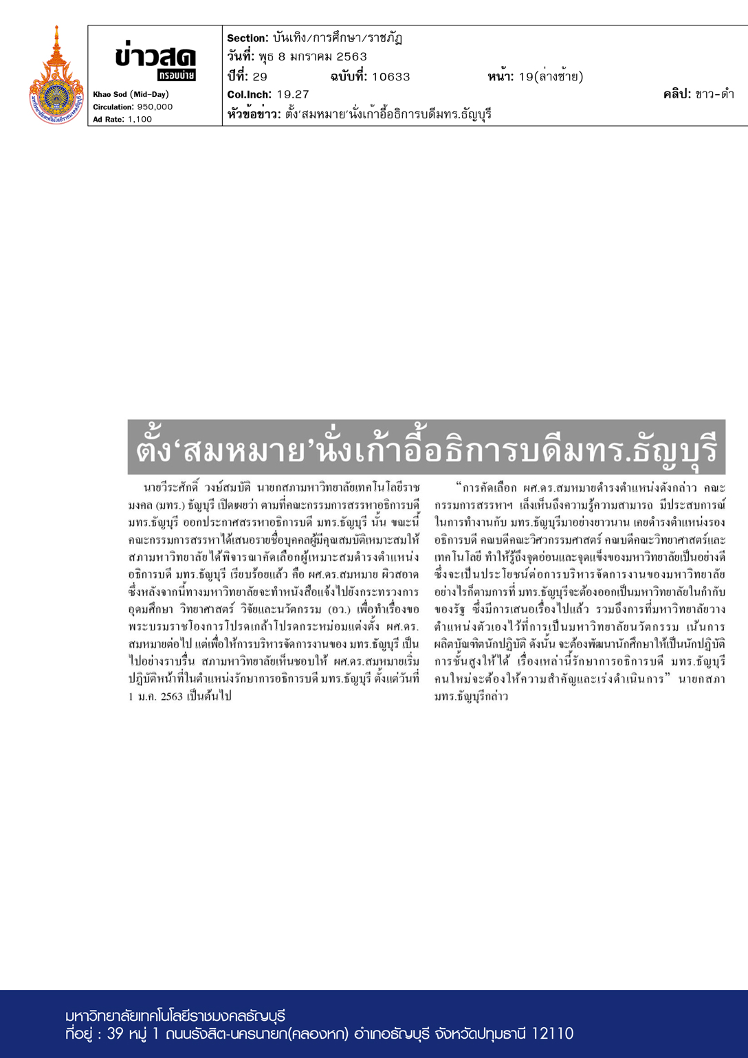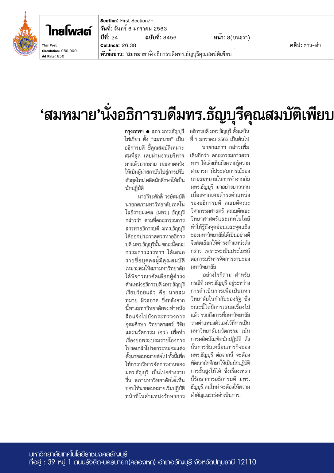 ตั้ง’สมหมาย’นั่งเก้าอี้อธิการบดีมทร.ธัญบุรี