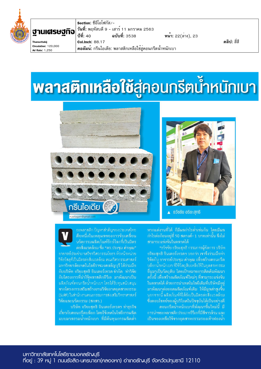 คอลัมน์ กรีนไอเดีย: พลาสติกเหลือใช้สู่คอนกรีตน้ำหนักเบา