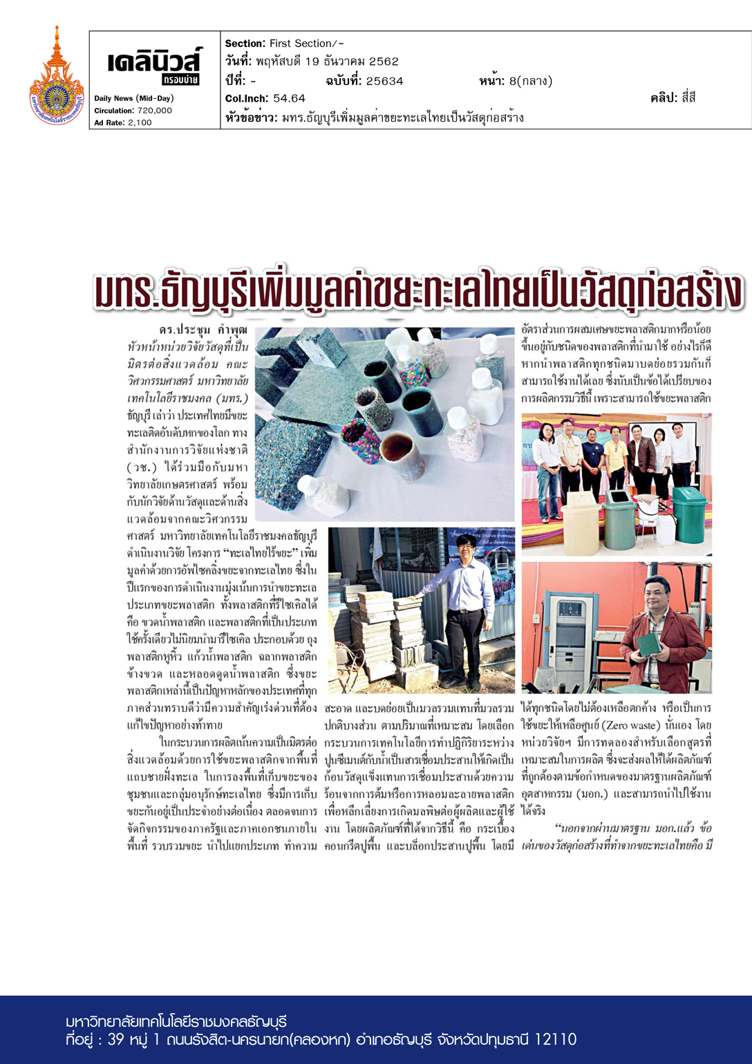 มทร.ธัญบุรีเพิ่มมูลค่าขยะทะเลไทยเป็นวัสดุก่อสร้าง