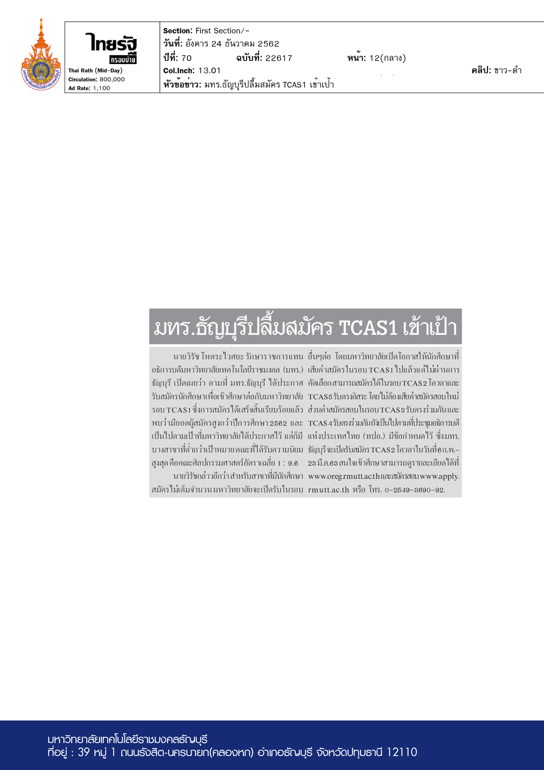 มทร.ธัญบุรีปลื้มสมัคร TCAS1 เข้าเป้า