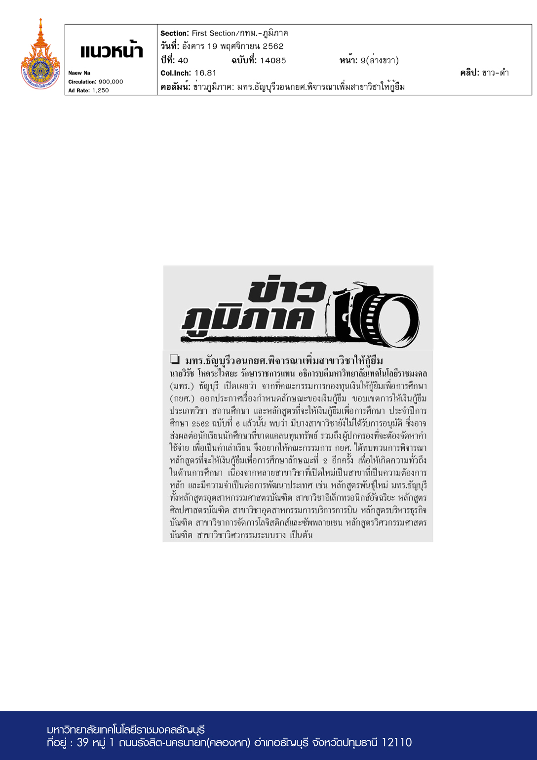 คอลัมน์ ข่าวภูมิภาค: มทร.ธัญบุรีวอนกยศ.พิจารณาเพิ่มสาขาวิชาให้กู้ยืม