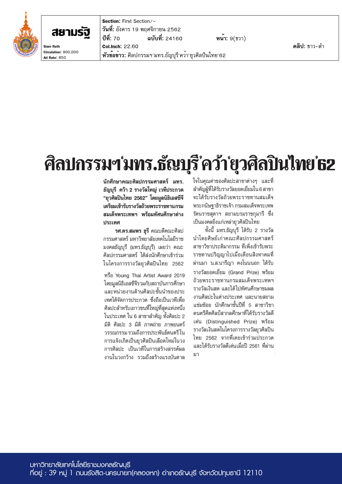 สยามรัฐ ฉบับวันที่ 19 พฤศจิกายน พ.ศ. 2562 นักศึกษาคณะศิ […]