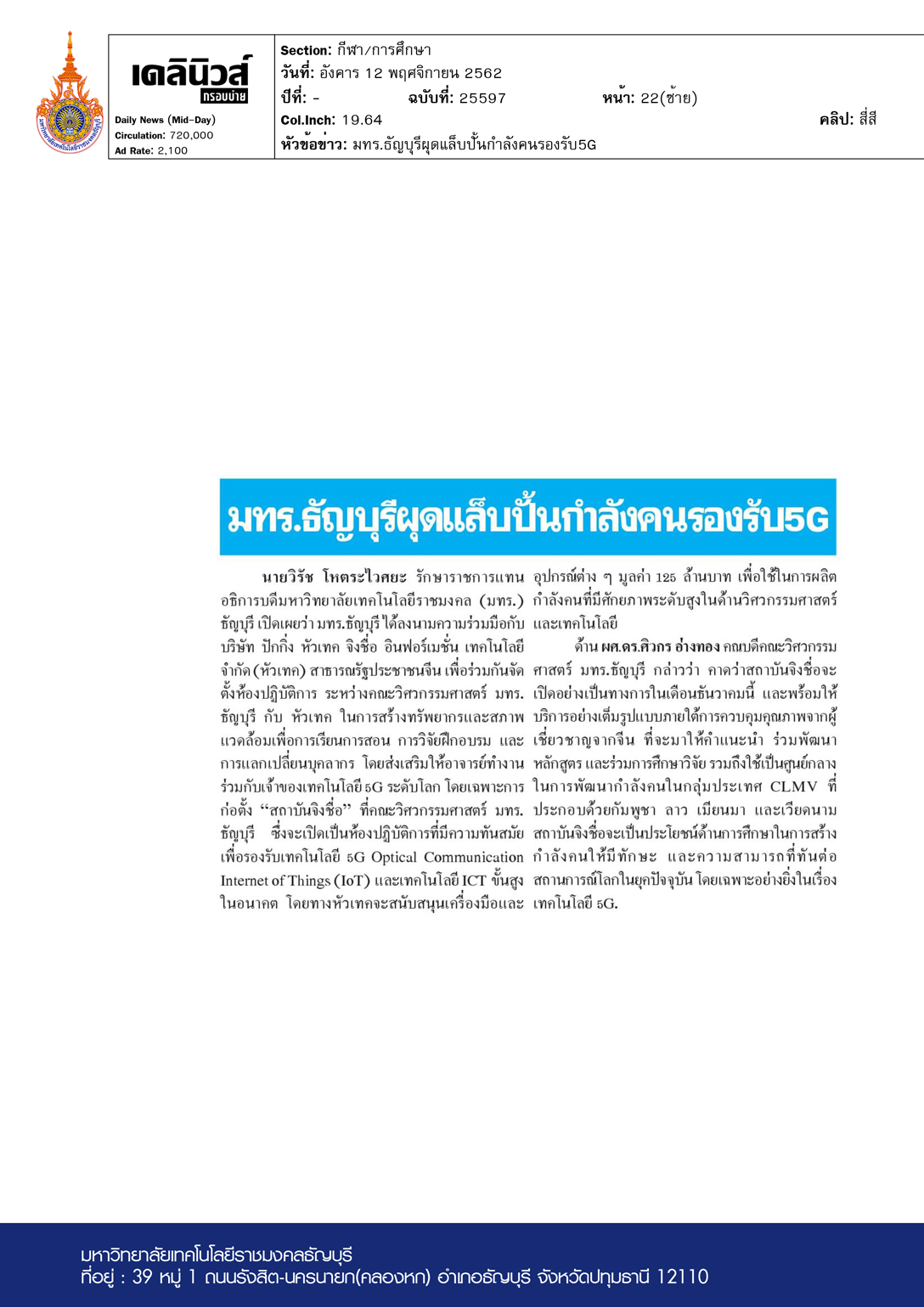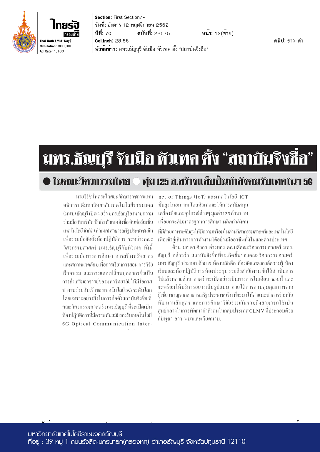 มทร.ธัญบุรีผุดแล็บปั้นกำลังคนรองรับ5G