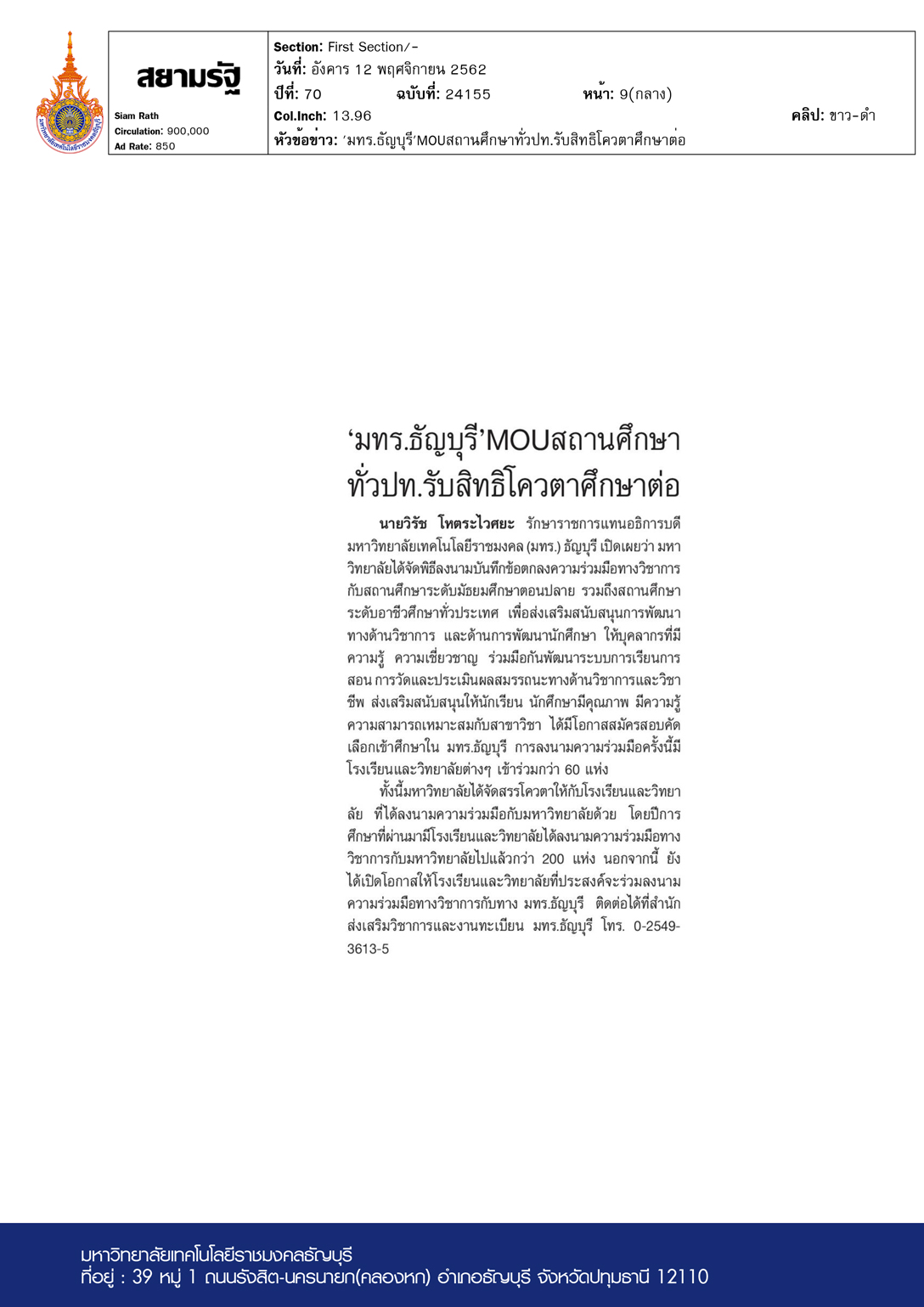 สถานศึกษาทั่วประเทศ “ตบเท้า MOU” มทร.ธัญบุรี รับสิทธิ์โควต้า