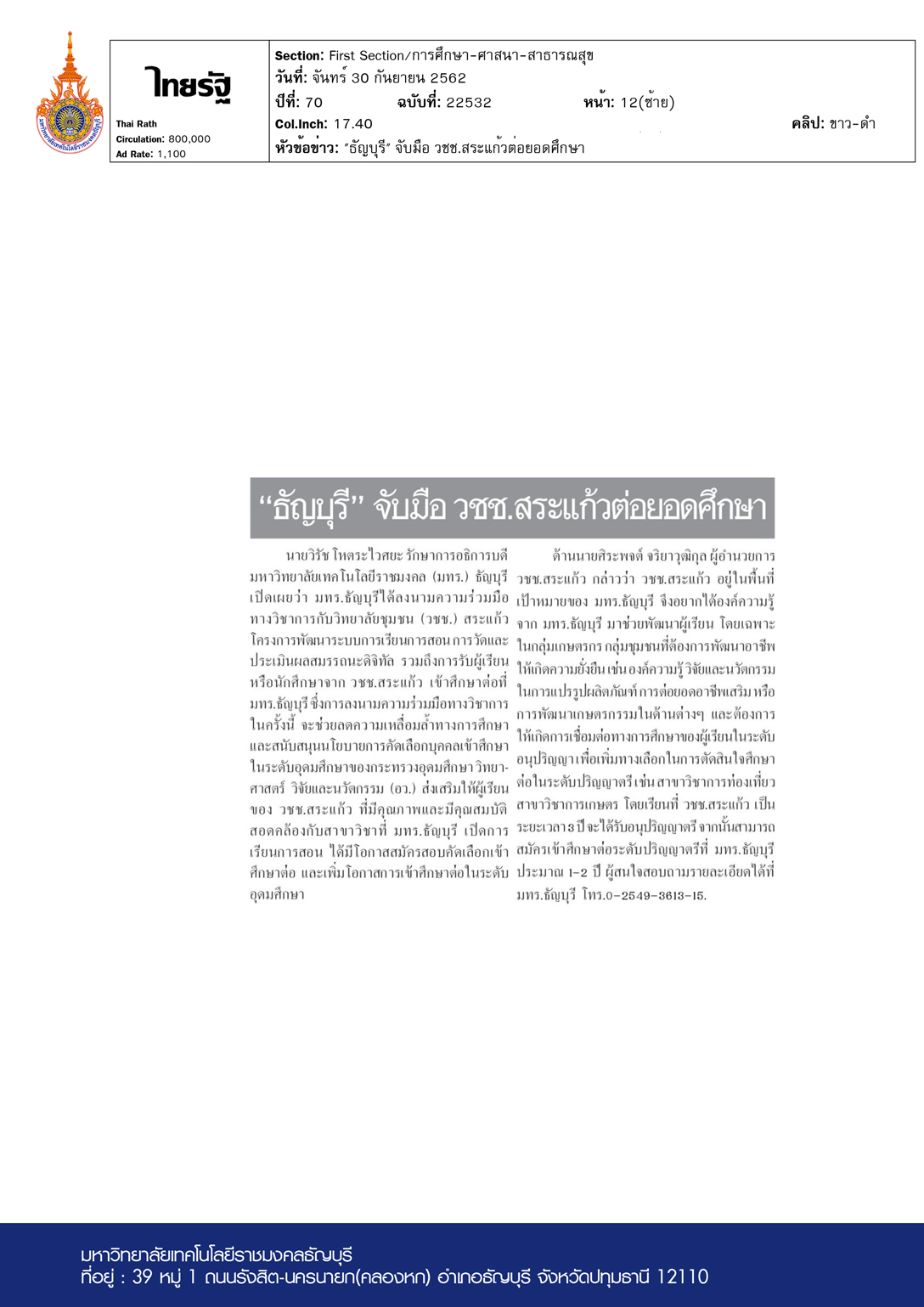 ไทยรัฐ ฉบับวันที่ 30 กันยายน พ.ศ. 2562 นายวิรัช โหตระไว […]