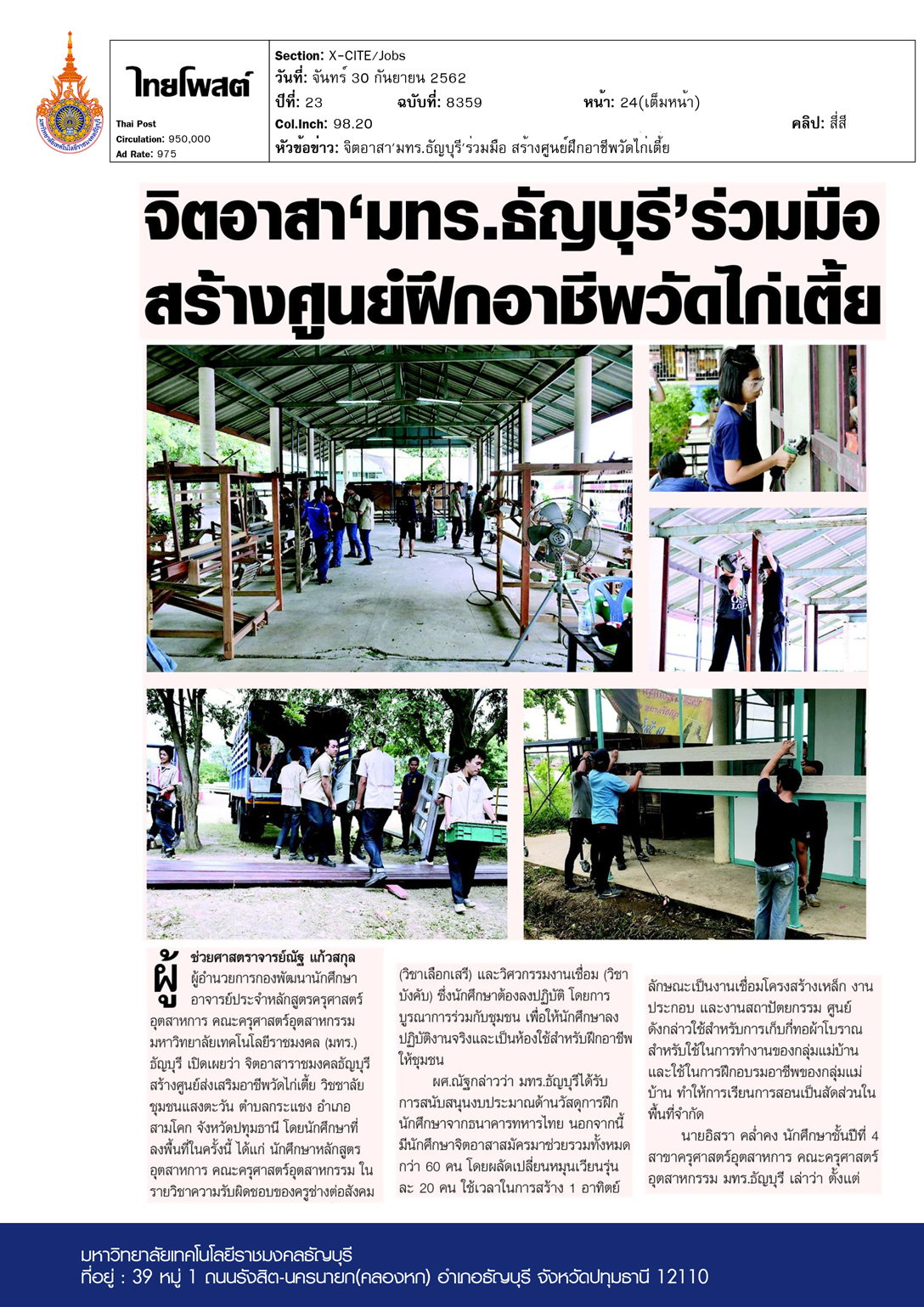จิตอาสา’มทร.ธัญบุรี’ร่วมมือ สร้างศูนย์ฝึกอาชีพวัดไก่เตี้ย
