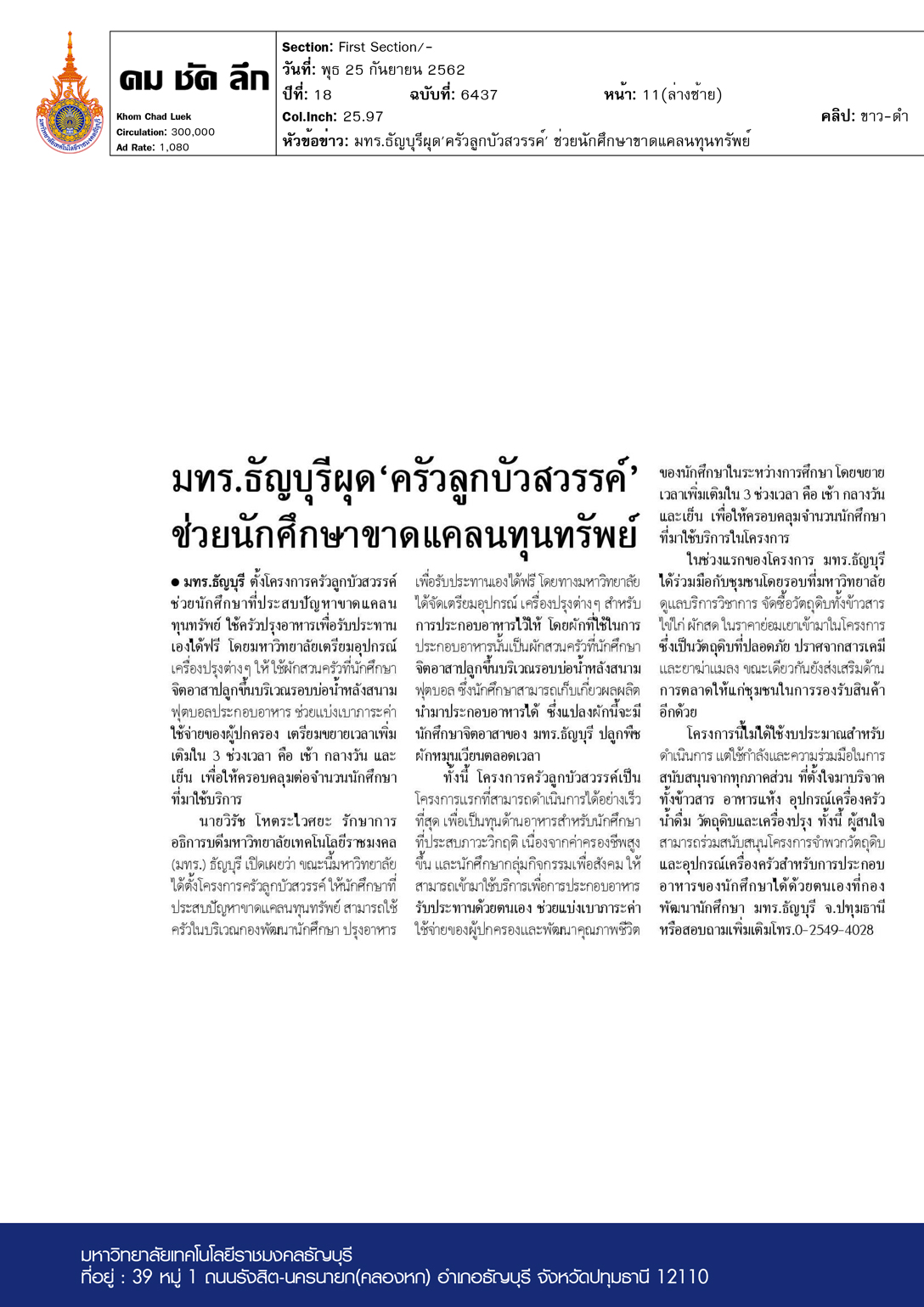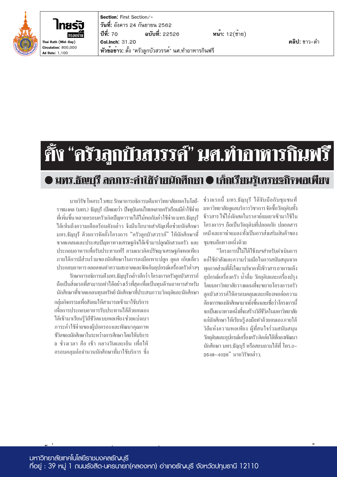 มทร.ธัญบุรีผุด’ครัวลูกบัวสวรรค์’ ช่วยนักศึกษาขาดแคลนทุนทรัพย์