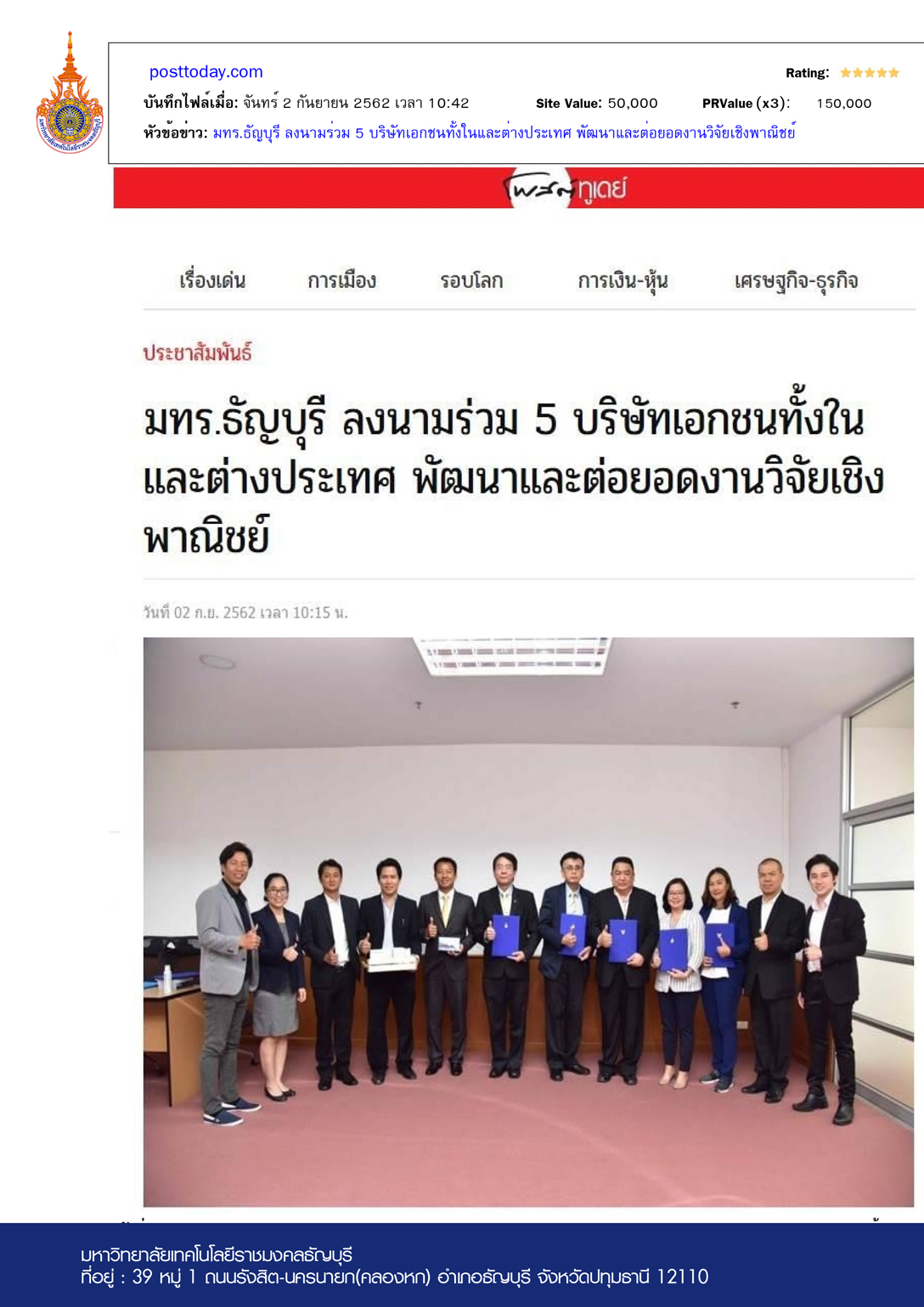 มทร.ธัญบุรี ลงนามร่วม 5 บริษัทเอกชนทั้งในและต่างประเทศ พัฒนาและต่อยอดงานวิจัยเชิงพาณิชย์
