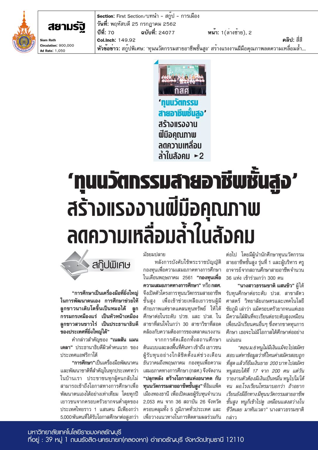 สยามรัฐ ฉบับวันที่ 25 กรกฎาคม พ.ศ. 2562 “การศึกษา […]