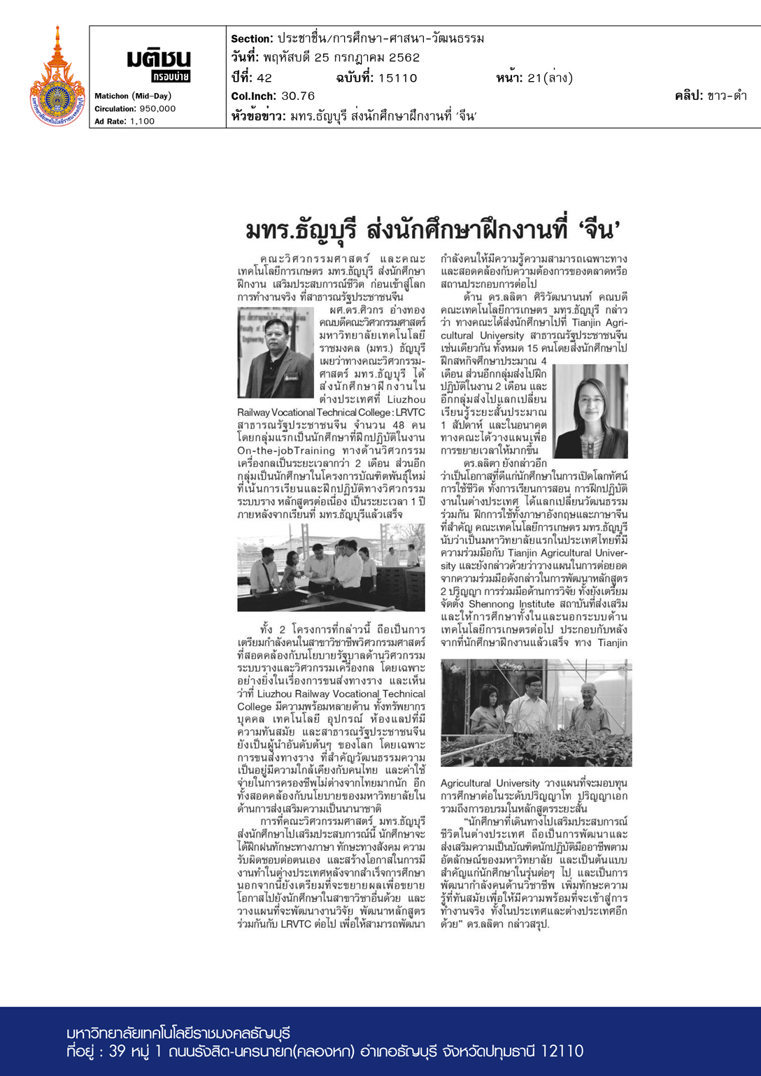 มทร.ธัญบุรี ส่งนักศึกษาฝึกงานที่ ‘จีน’