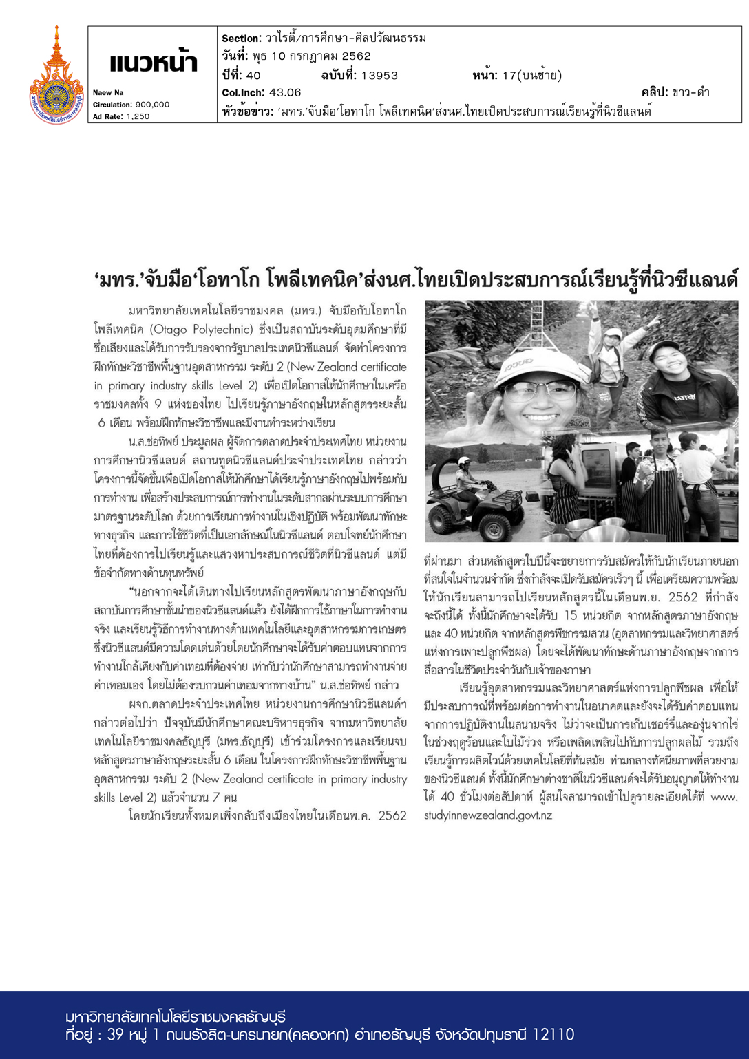 ‘มทร.’จับมือ’โอทาโก โพลีเทคนิค’ส่งนศ.ไทยเปิดประสบการณ์เรียนรู้ที่นิวซีแลนด์