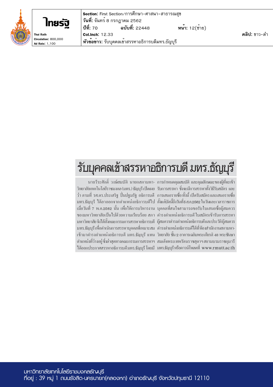 รับบุคคลเข้าสรรหาอธิการบดีมทร.ธัญบุรี