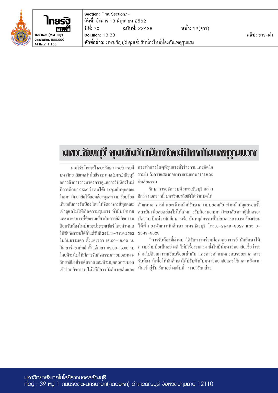 มทร.ธัญบุรี คุมเข้มรับน้องใหม่ป้องกันเหตุรุนแรง