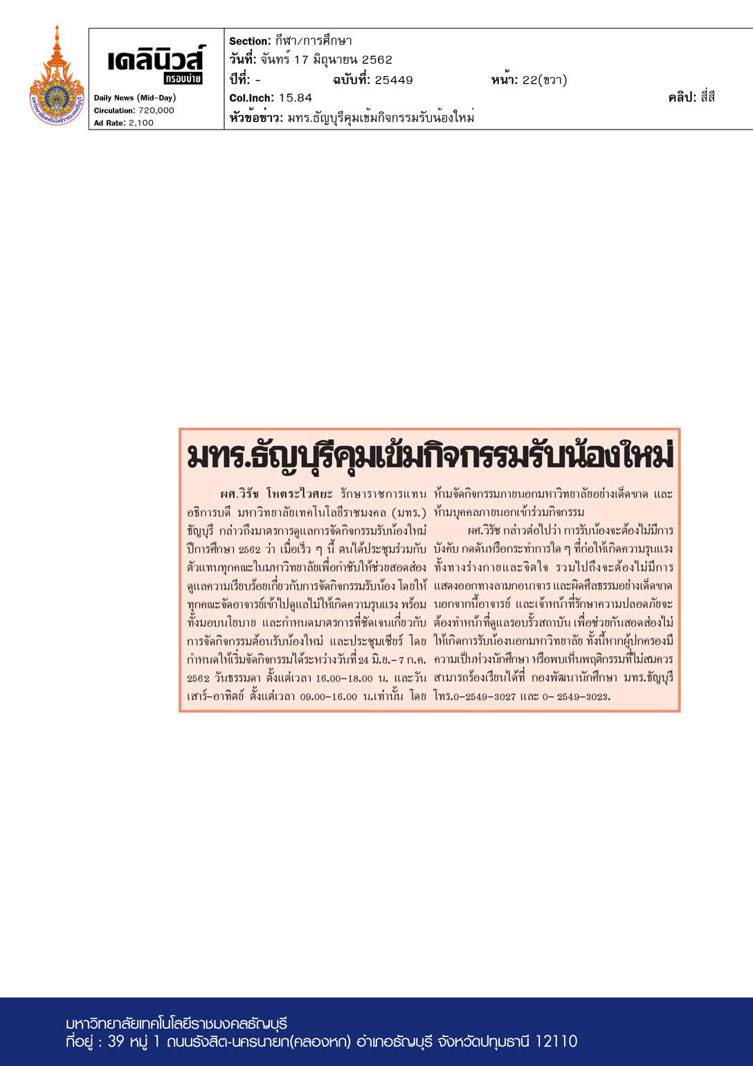 มทร.ธัญบุรีคุมเข้มกิจกรรมรับน้องใหม่