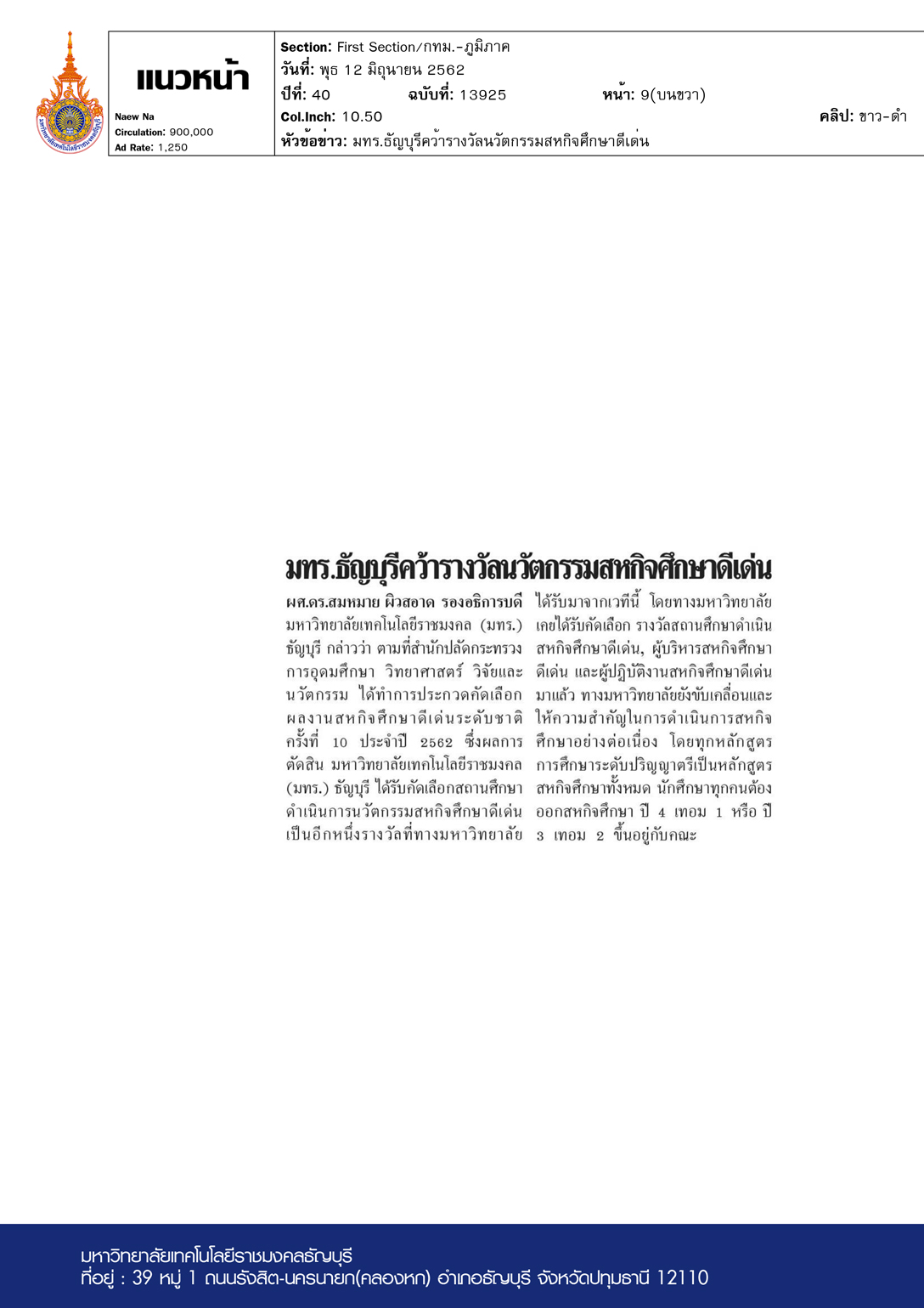 มทร.ธัญบุรีคว้าสหกิจศึกษาดีเด่น 62
