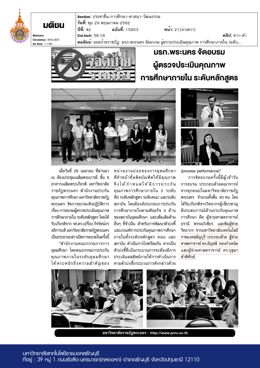 คอลัมน์ จอดป้ายราชภัฏ: มรภ.พระนคร จัดอบรม ผู้ตรวจประเมินคุณภาพ การศึกษาภายใน ระดับหลักสูตร
