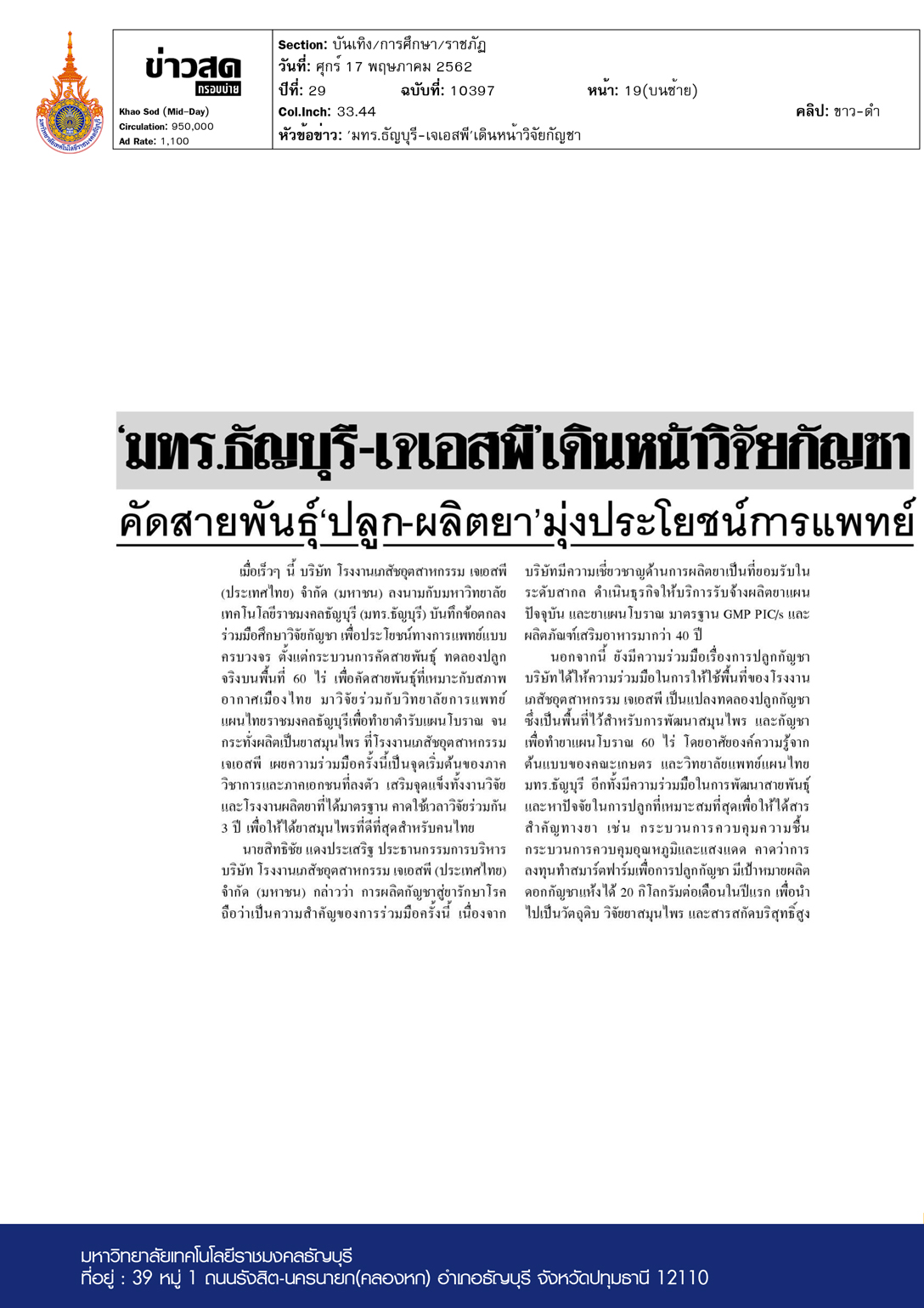 ‘มทร.ธัญบุรี-เจเอสพี’เดินหน้าวิจัยกัญชา