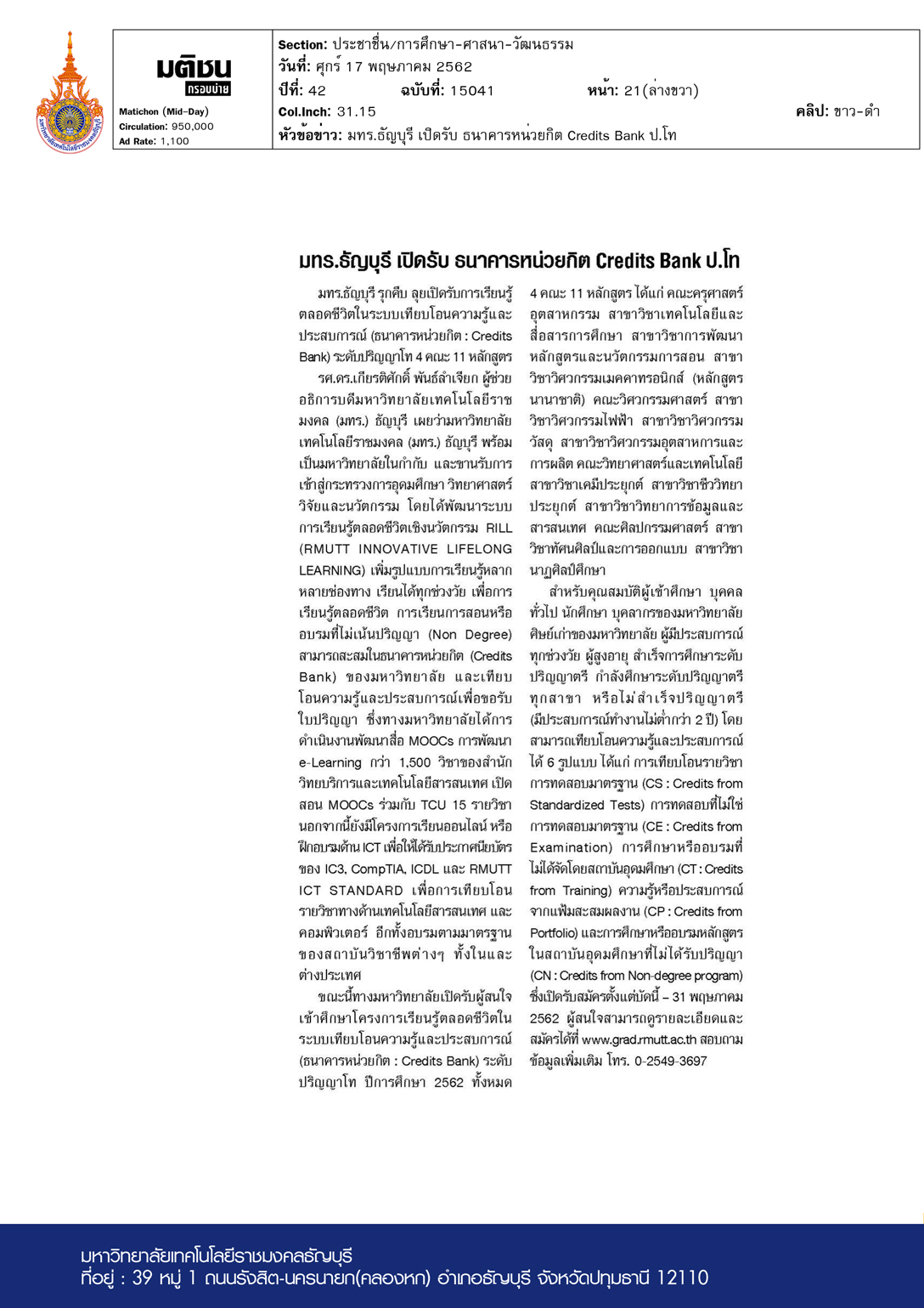 มทร.ธัญบุรี เปิดรับ ธนาคารหน่วยกิต Credits Bank ป.โท