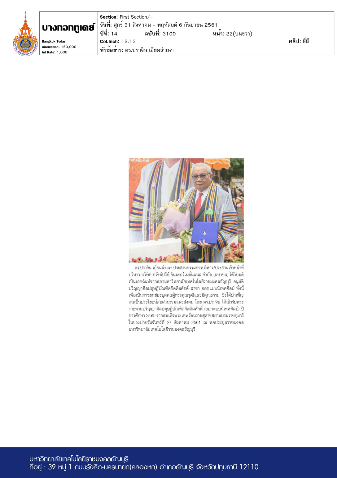 บางกอกทูเดย์ ฉบับวันที่ 31 สิงหาคม พ.ศ. 2561 ดร.ปราจิน […]