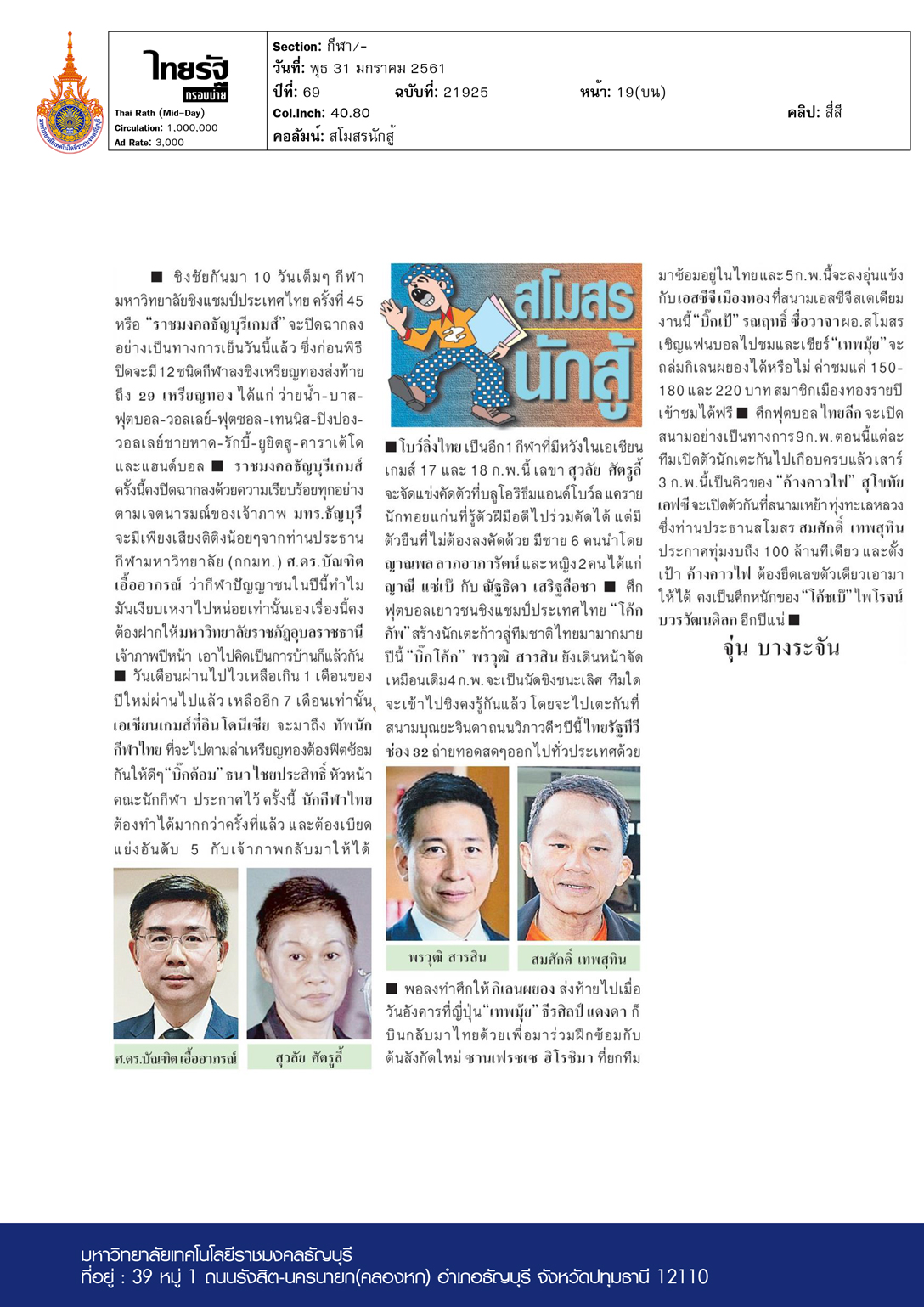ไทยรัฐ ฉบับวันที่ 30 มกราคม พ.ศ. 2561 ไชยสาร หอมบุญ (เบ […]
