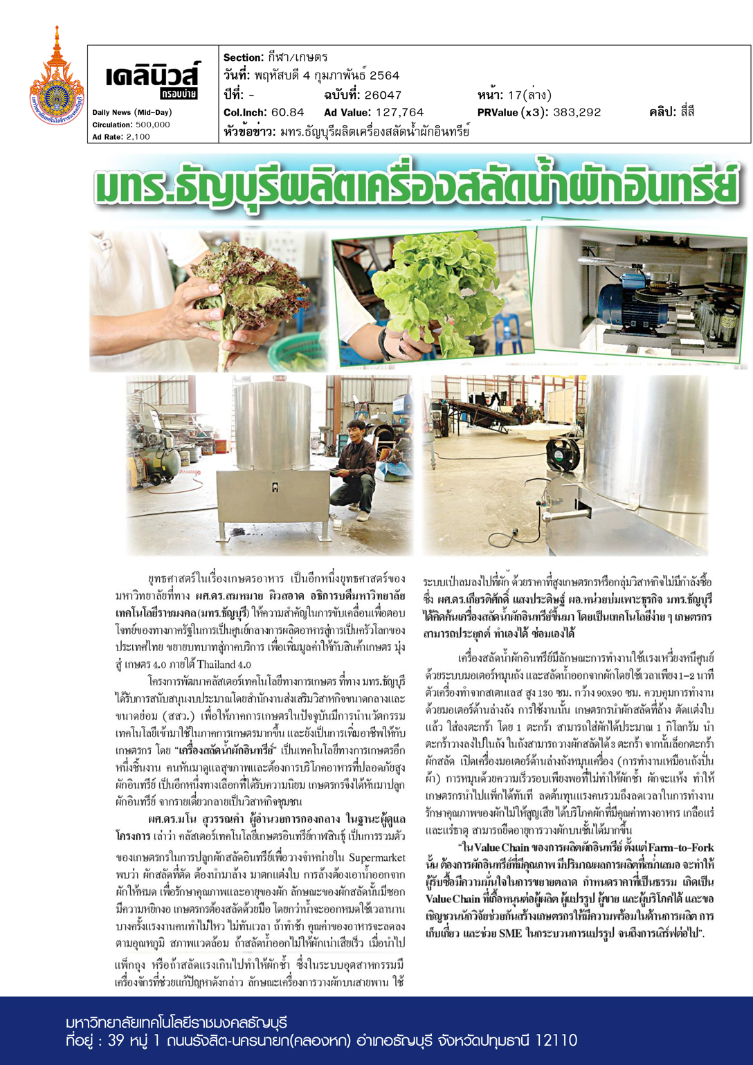 มทร.ธัญบุรีผลิตเครื่องสลัดน้ำผักอินทรีย์