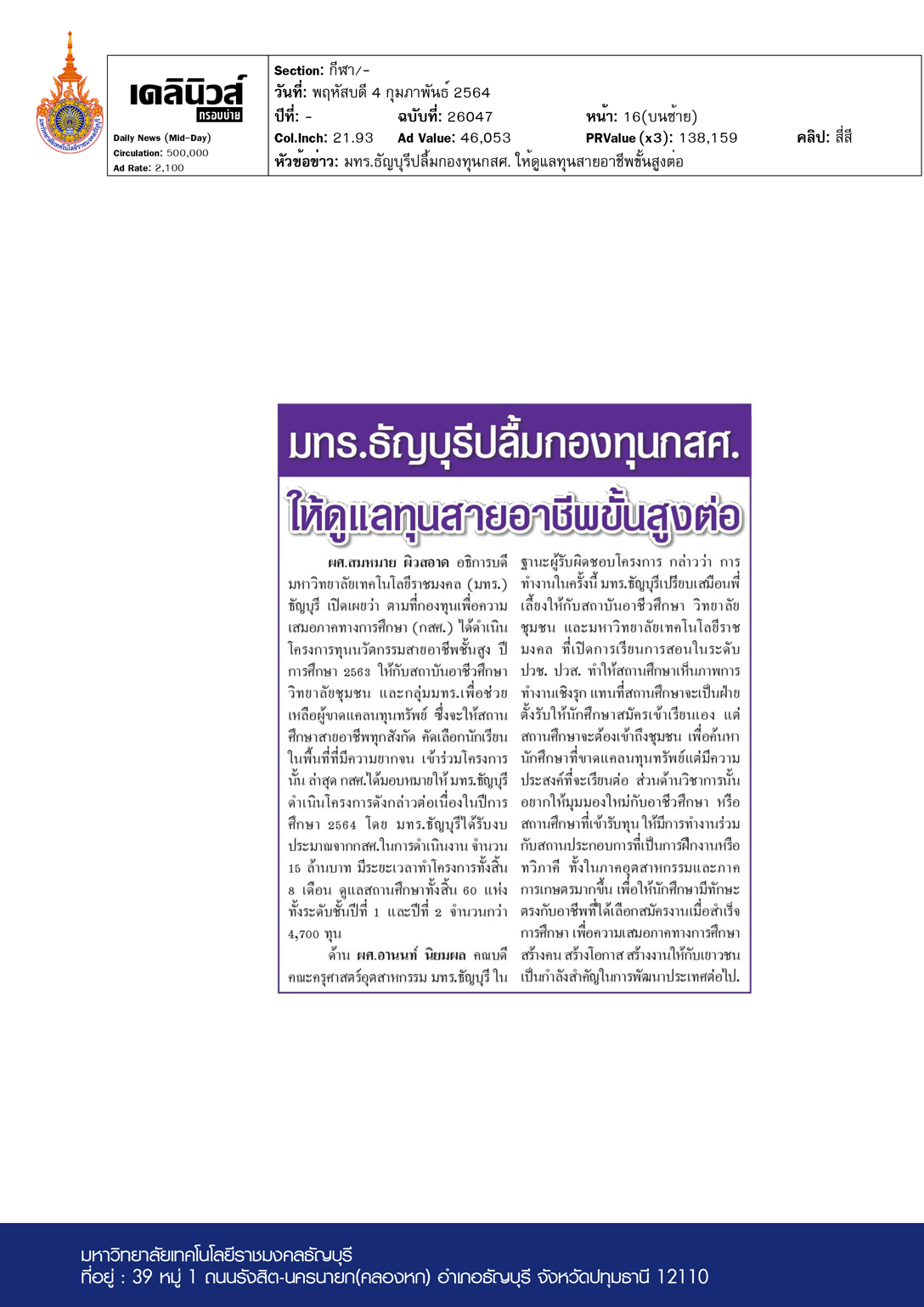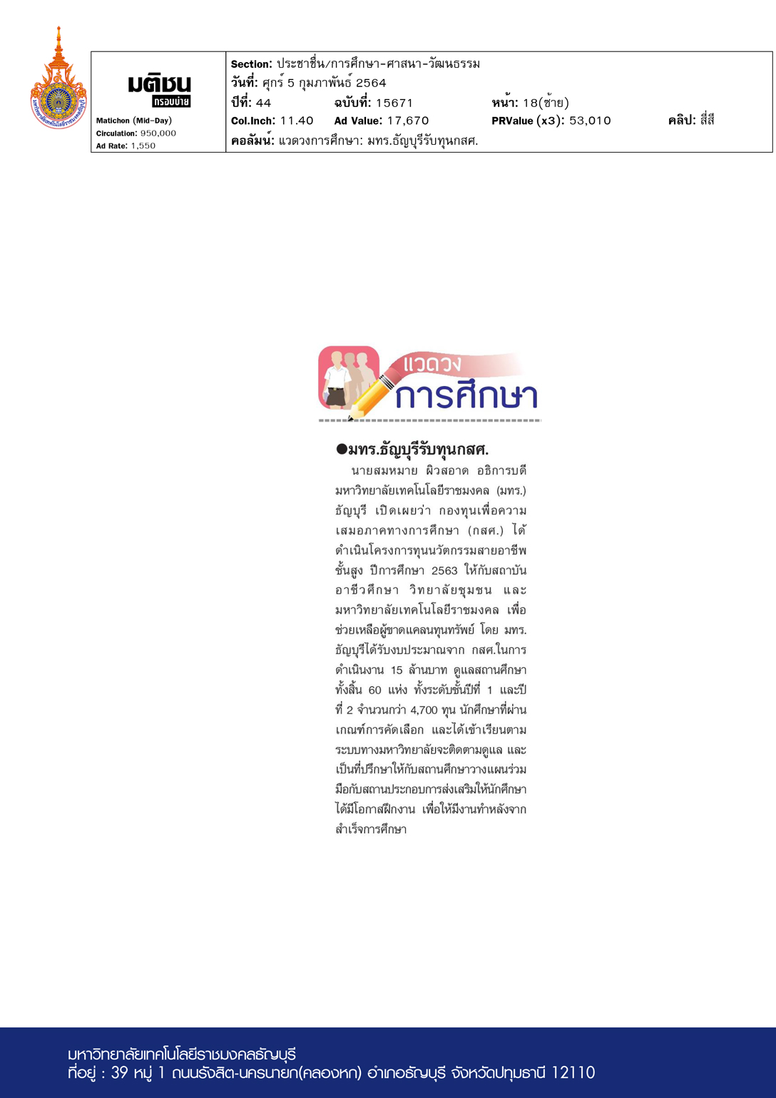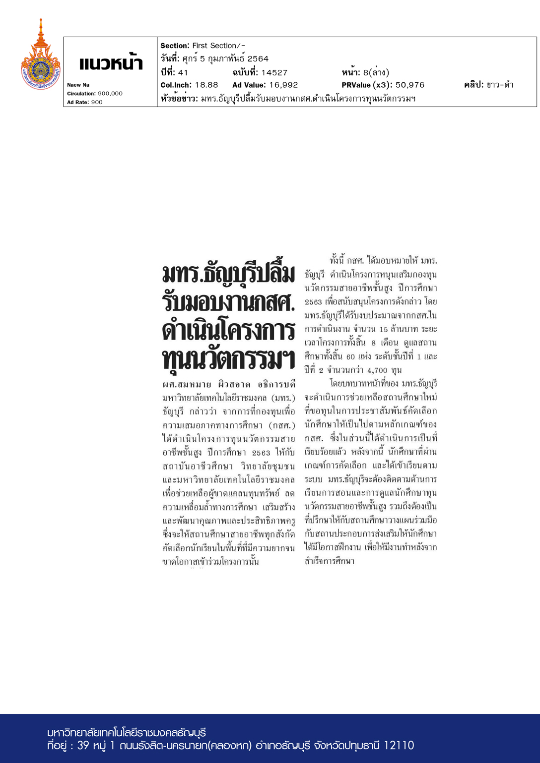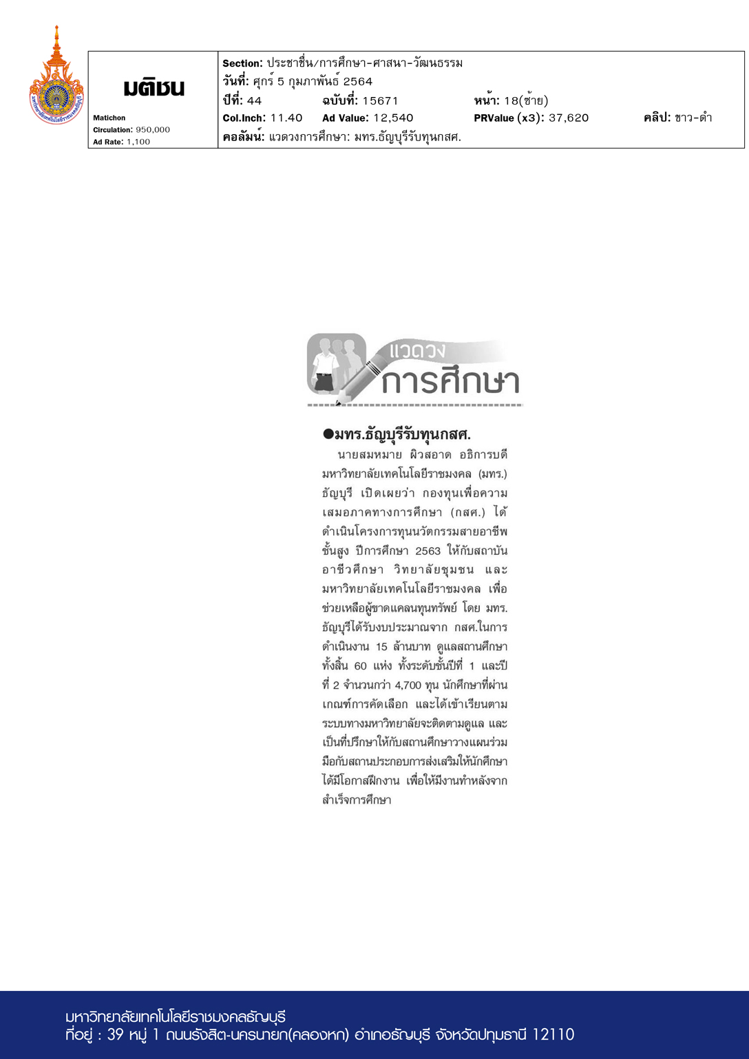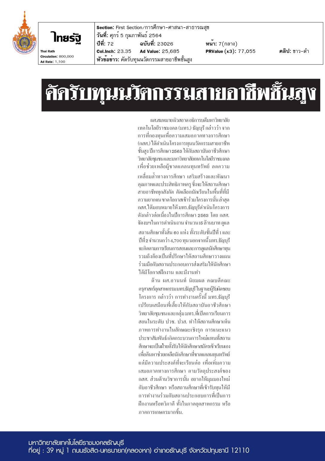 คอลัมน์ แวดวงการศึกษา: มทร.ธัญบุรีรับทุนกสศ.